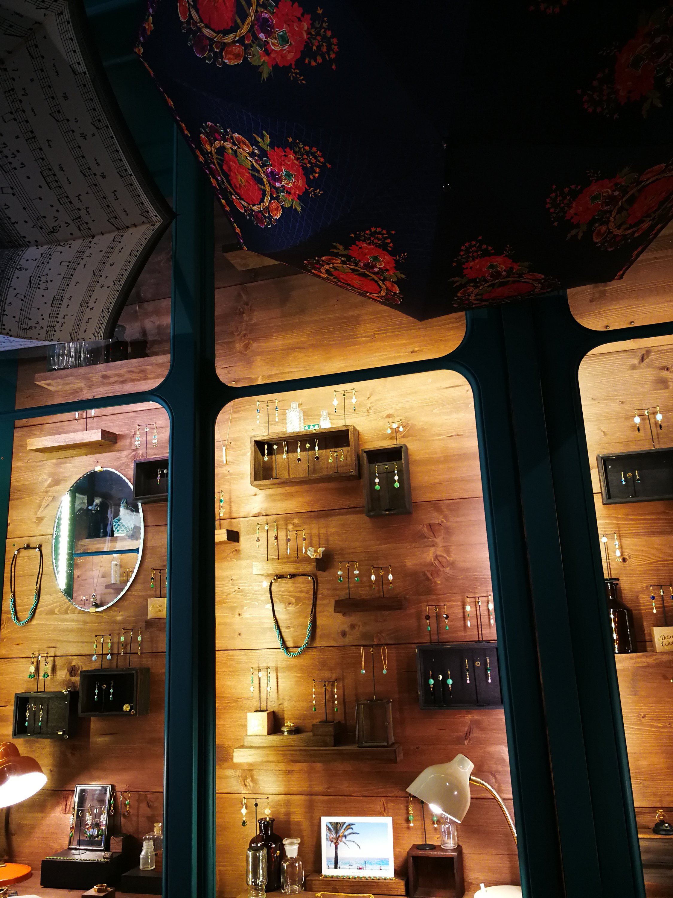 LES DèLICES DE CANDICE, boutique di bijoux all’interno di un negozio d’epoca di ombrelli del 1850: fuori si può ancora scorgere l’insegna luminosa, dentro l’antico mobilio verde con cassetti diventa lo spazio per far brillare i piccoli gioielli.