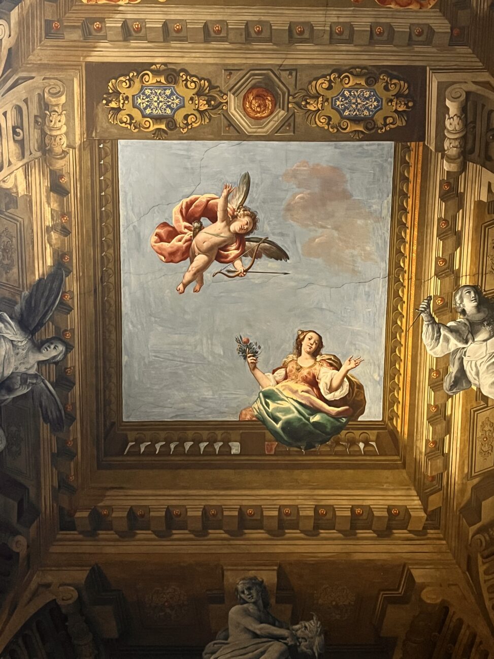 Sulla nostra destra lo scalone che porta ai piani nobili, con il naso all’insù come a guardare le stelle, gli occhi si illuminano alla vista degli splendidi affreschi, di tema mitologico con un cornicione che rappresenta la bella storia di Amore e Psiche.