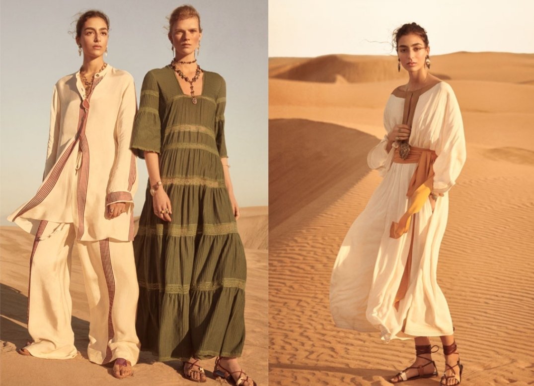 Un tuffo nella calda sabbia del deserto del Marocco: la nuova collezione si presenta con riferimenti chiaramente legati alla storia di questo incredibile paese. Abiti prevalentemente lunghi in tessuti corposi come il lino e il cotone, due pezzi formati da lunghe tuniche e pantaloni. I colori sono quelli classici del Marocco, dalle terre rosse ai bianchi e i marroni, le stampe geometriche e decorazioni con pietre che terminano su lunghi nastrini. Gli accessori non mancano d’essere ancora una volta incredibilmente originali: lunghe catene, maglie, anelli, collane, orecchini e bracciali in ottone impreziositi da pietre vere colorate grezze o lucide sono complemento perfetto per questi abiti.