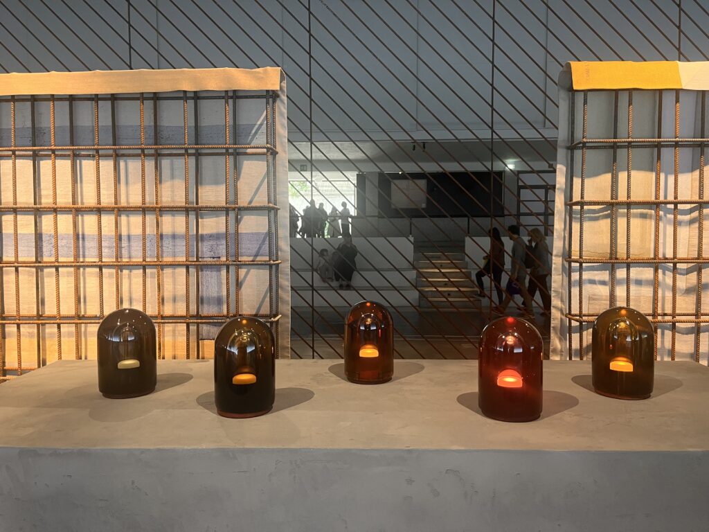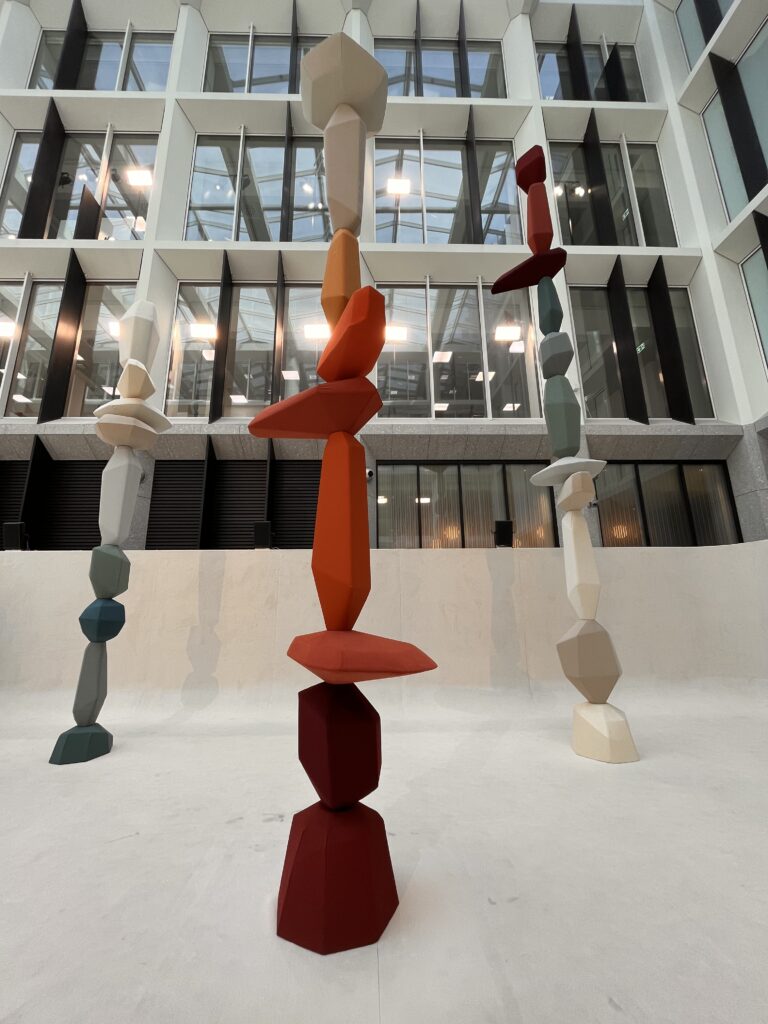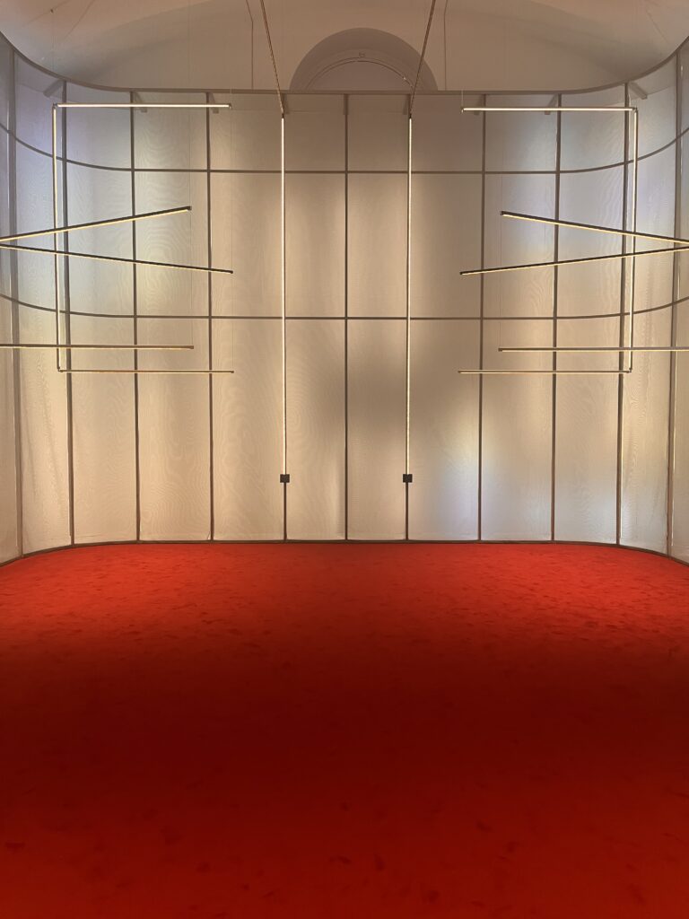 Nella sede LORO PIANA in un splendido spazio si viene accolti da un’ambiente di luce e profumi, una musica rilassante dove Raphael Navot ricrea un’ambiente desertico, soffice moquette come sabbia da dove si innalzano sculture alte come guardiani: elementi geometrici giocano con stoffe di vari colori creando un immagine onirica.