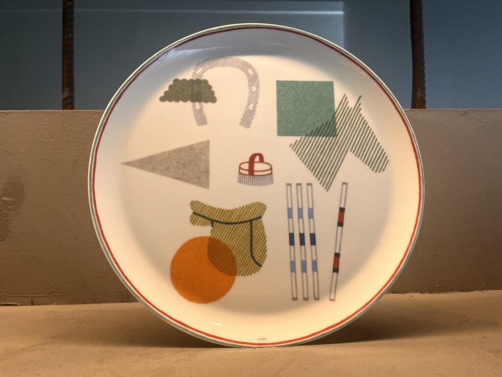 Nello spazio espositivo la Pelota, HERMÈS ripercorre il savoir faire della Maison, tappeti, divani e uno splendido servizio di porcellana per la tavola con simboli equestri stilizzati che si ripercorrono su di un fondo bianco.