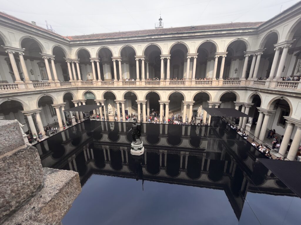 La bellezza lascia posto all’installazione GROHE Spa, all’Accademia di Brera, dove un gioco di specchi e riflessi in uno specchio d’acqua sembra far fluttuare la statua di Napoleone.