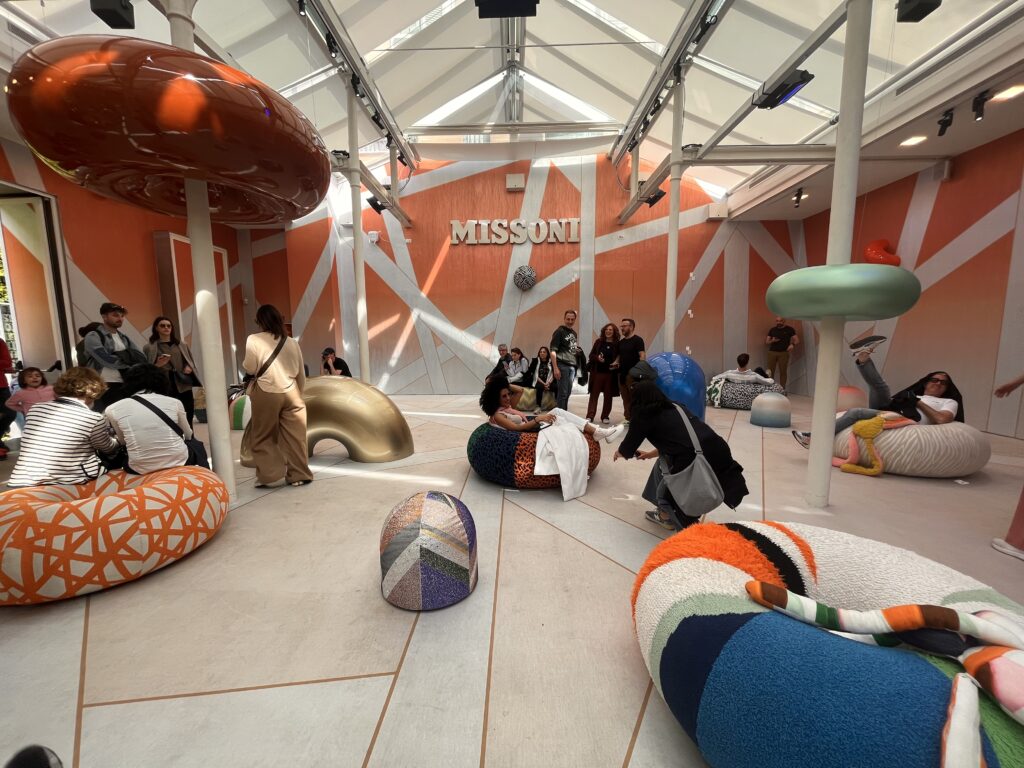 MISSONI crea uno spazio gioco e relax con coniglietti colorati ed enormi cuscini in tessuto classico a righe e grandi salvagenti in plastica colorata o ricoperti di piccoli specchietti che riflettono la luce che proviene dalle finestre.